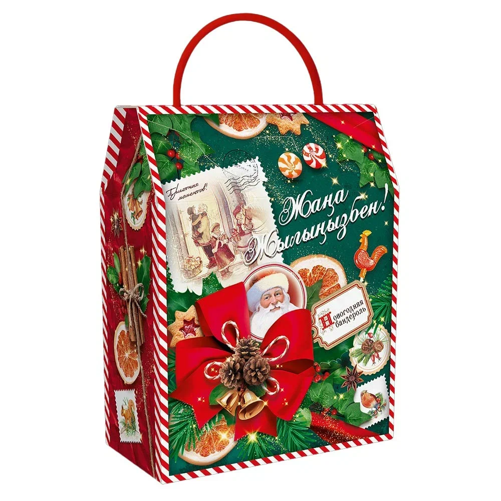 Элегантная новогодняя коробка с зелёно-красным оформлением, украшенная шишками, сладостями, лентами и изображением Деда Мороза, с надписью «Счастливого Нового Года!».