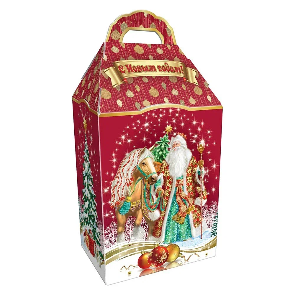 Праздничная коробка в красно-золотых тонах с изображением Деда Мороза и коня на фоне ёлки и звёзд, украшенная надписью «С Новым годом!».
