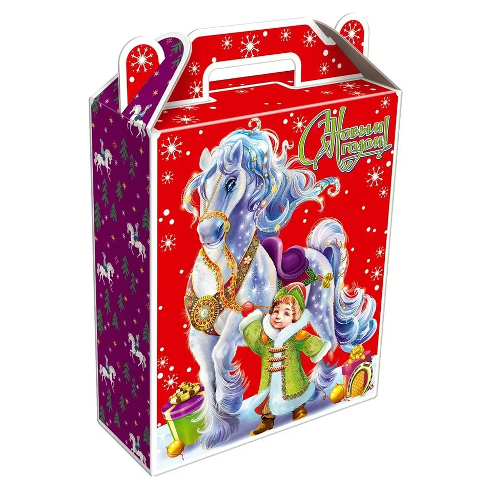 Коробка в красном оформлении с голубой лошадью и ребенком в новогоднем костюме с надписью «С Новым годом!».