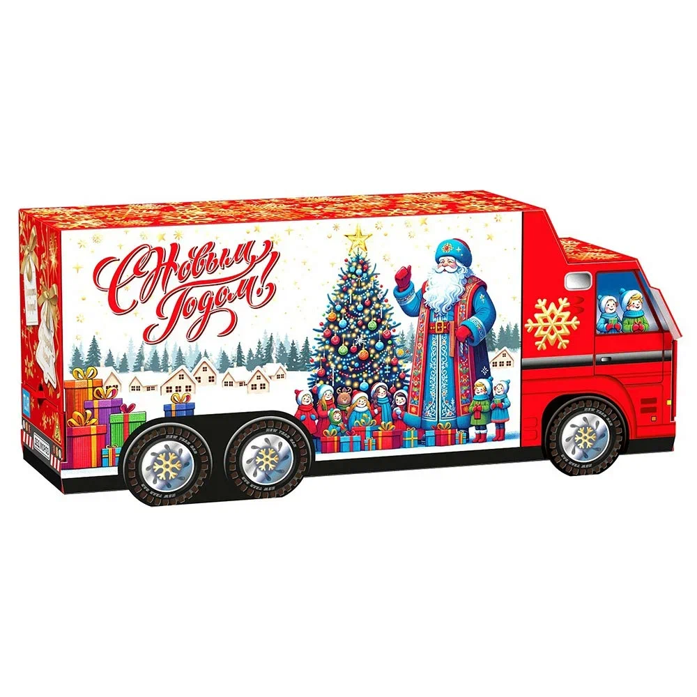 Коробка в виде красного грузовичка украшена яркими новогодними изображениями, включая Деда Мороза и елку, с надписью «С Новым годом!».