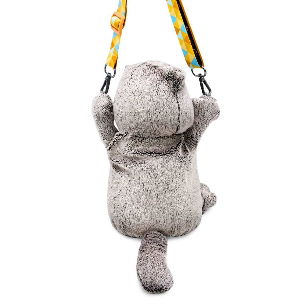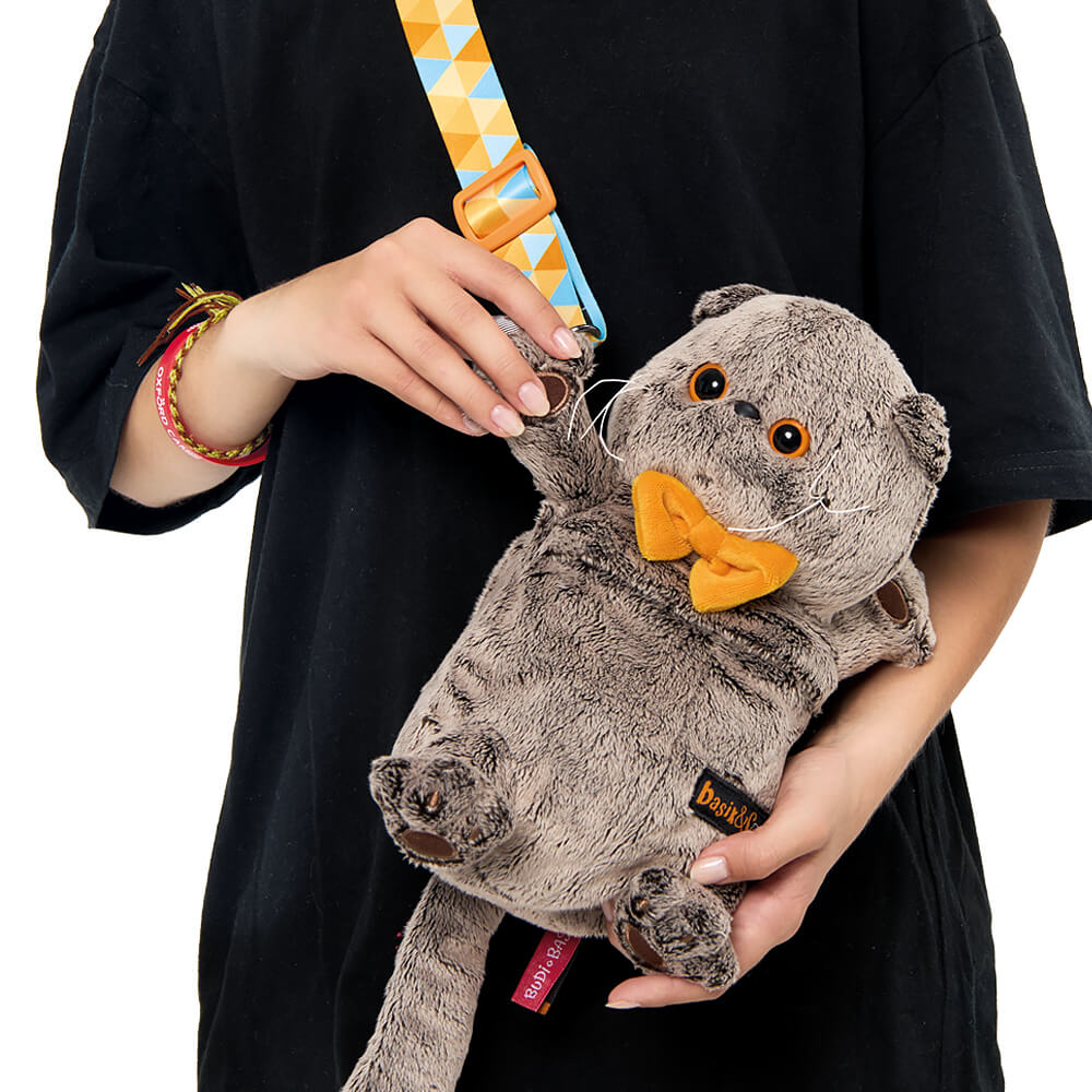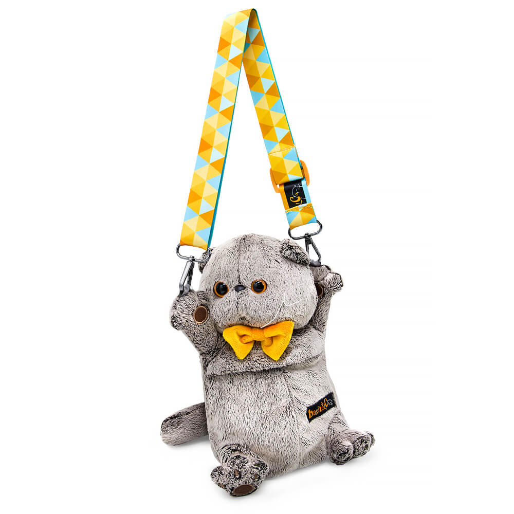 Сумка кот Басик с галстуком-бабочкой из мягкого софта золотисто-охристого цвета. Басик будто раскрывает лапки в дружеском объятии. Сумка сшита из оригинального меха, с одним отделением с подкладкой и фирменным ремнем, который легко регулируются по росту.